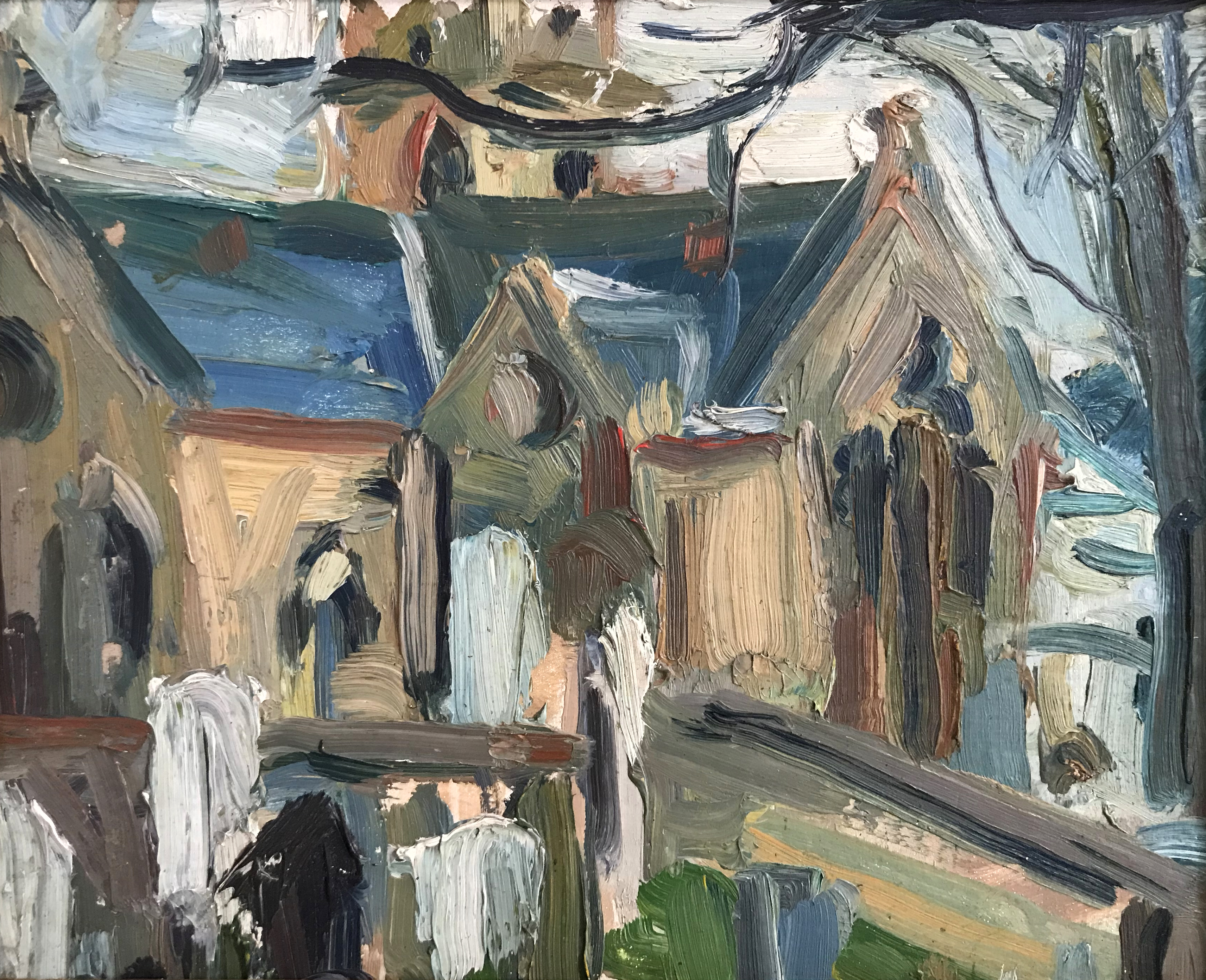 Ornately framed original late 1800s oil painting on board. Abstract painting on the back.